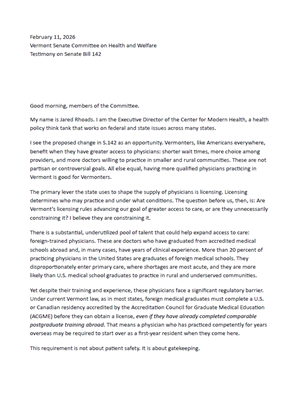 Rhoads, J. "Remarks on Foreign-Trained Physicians: Testimony on Vermont S 142" Center for Modern Health. February 2026.