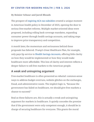 Schuur, R. and Rhoads, J. "How Not to Sell Free-Market Healthcare Ideas" Center for Modern Health. February 2026.