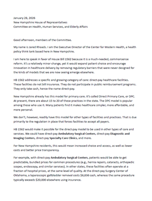 Rhoads, J. "Remarks on Direct-Pay Healthcare: Testimony on New Hampshire HB 1562" Center for Modern Health. January 2026.